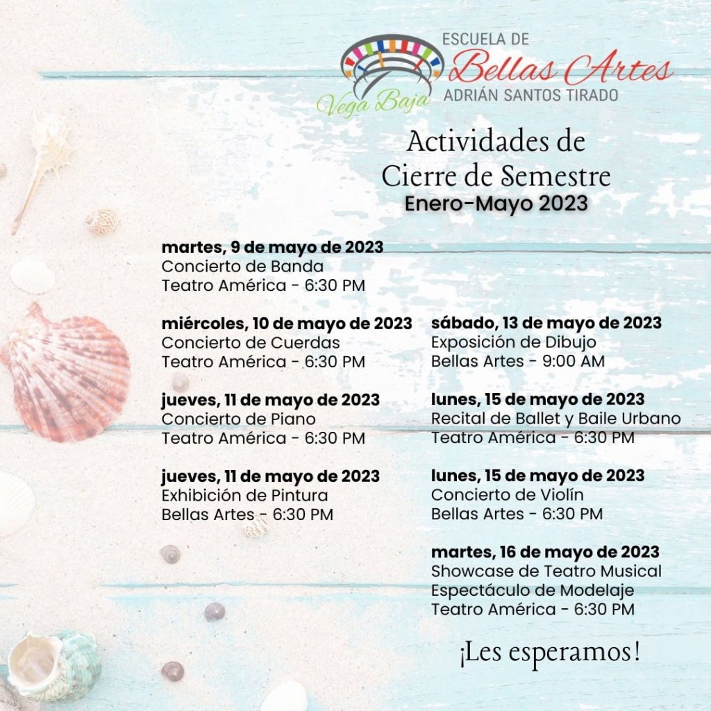 mayo 1, 2023 diariovegabajenopuertorico.com Actividades de Cierre de Semestre de la Escuela de Bellas Artes 9 al 16 de mayo de 2023 Comparte esto: Compartir en X (Se abre en una ventana nueva) X Comparte en Facebook (Se abre en una ventana nueva) Facebook Me gusta Cargando... Relacionado