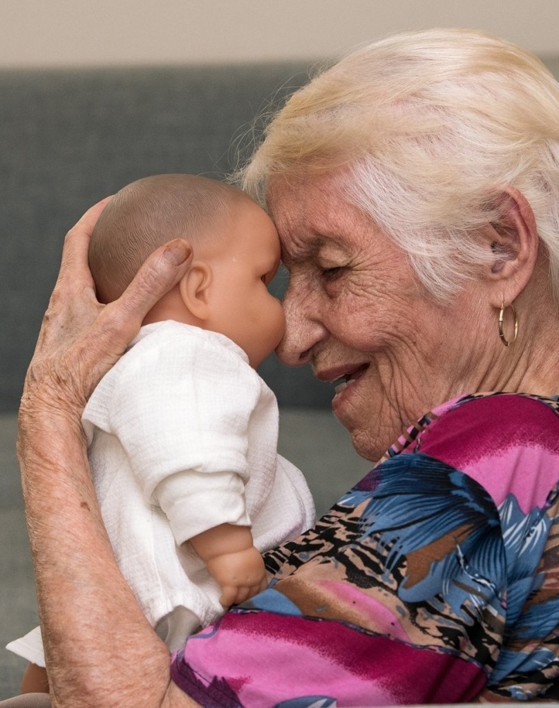 Esta fotografía pertenece al álbum familiar de Roberto Rivera Arocho, porque se trata de la matriarca que dió a luz varios seres de excelencia, incluyéndolo a él. Parece que tiene en sus brazos a un niño, pero no lo es. Lo importante es que por el paso de los años, aunque su mente tal vez no le permita distinguir un muñeco, su ternura y amor es la misma. No ha cambiado.