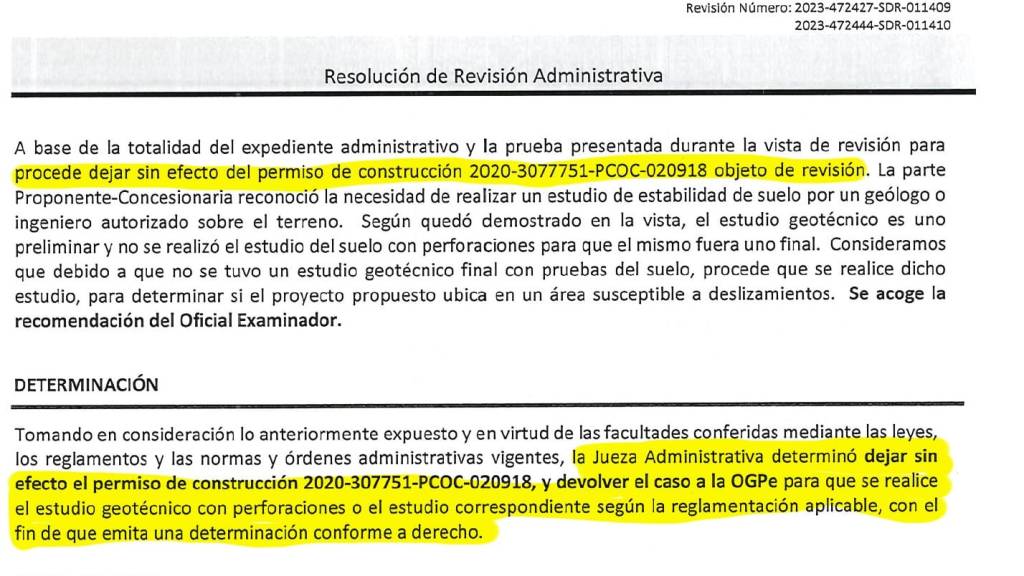 La razón fue que no se hizo un estudio geotécnico sobre la estabilidad del suelo, circunstancia que fue reconocida por la compañía proponente. Esto no significa una victoria total ya que de hacerse el estudio y la parte proponente cumplir y ser viable a tenor con los reglamentos vigentes, pudiera aprobarse eventualmente la construcción.