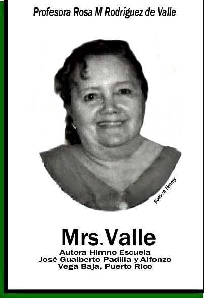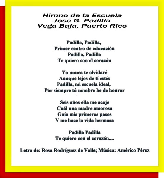 La que conocíamos hasta el momento fue la creada en la década de 1950 y publicada en 2004 en el tomo 7 de Historias de Vega Baja dedicada a José Gualberto Padilla y la escuela que lleva su nombre por mi padre Thomas Rosario Flores (Jimmy), insertada a continuación: