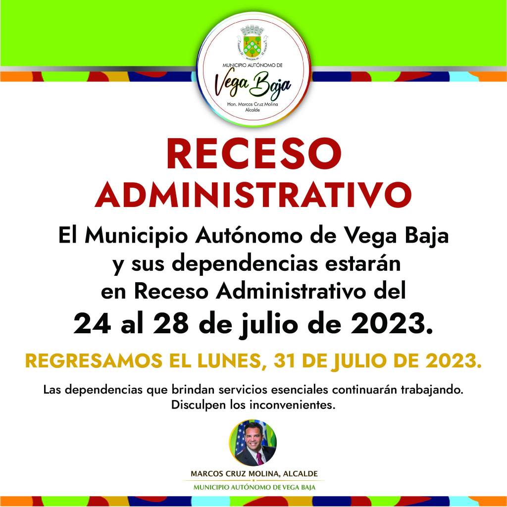 Para la semana del 24 al 28 de julio de 2023 la Administración Municipal de Vega Baja estará en receso administrativo. Se informa que las agencias municipales de servicio escencial (esencial) continuarán con sus labores.