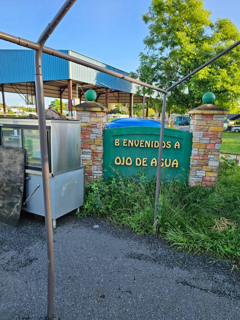 El concepto de Salud Ambiental ni de mantenimiento podemos entenderlo en este portal. Le falta la letra I a la estructura y al frente tiene un armazón y un equipo que le quitan visibilidad. A los otros dos letreros también le faltan letras. Debieron arreglarlos antes de pintarlos porque si el fin es identificar la comunidad, para el que no conoce estos lugares, puede confundirse.