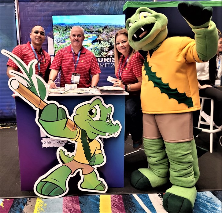Miembros de la Secretaría de Turismo, mArte y Cultura de Vega Baja junto a la mascota Cai de Vega Baja en la Exposición de Turismo Next en el Centro de Convenciones de Puerto Rico