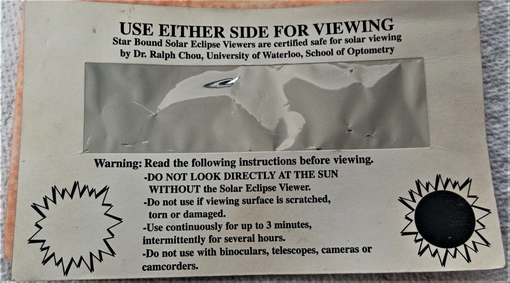 Desde hace años tengo un «Solar Eclipse Viewer» esperando que hubiese un eclipse solar para satisfacer mi curiosidad y tener esa experiencia. He estado largas horas viendo como la luna se transforma en un eclipse lunar y de veras que me gustaría tener la experiencia de observar uno solar. El próximo será en una fecha incierta para mi vida en el futuro, pero para esta oprtunidad de hoy, paso, como decimos en el dominó.