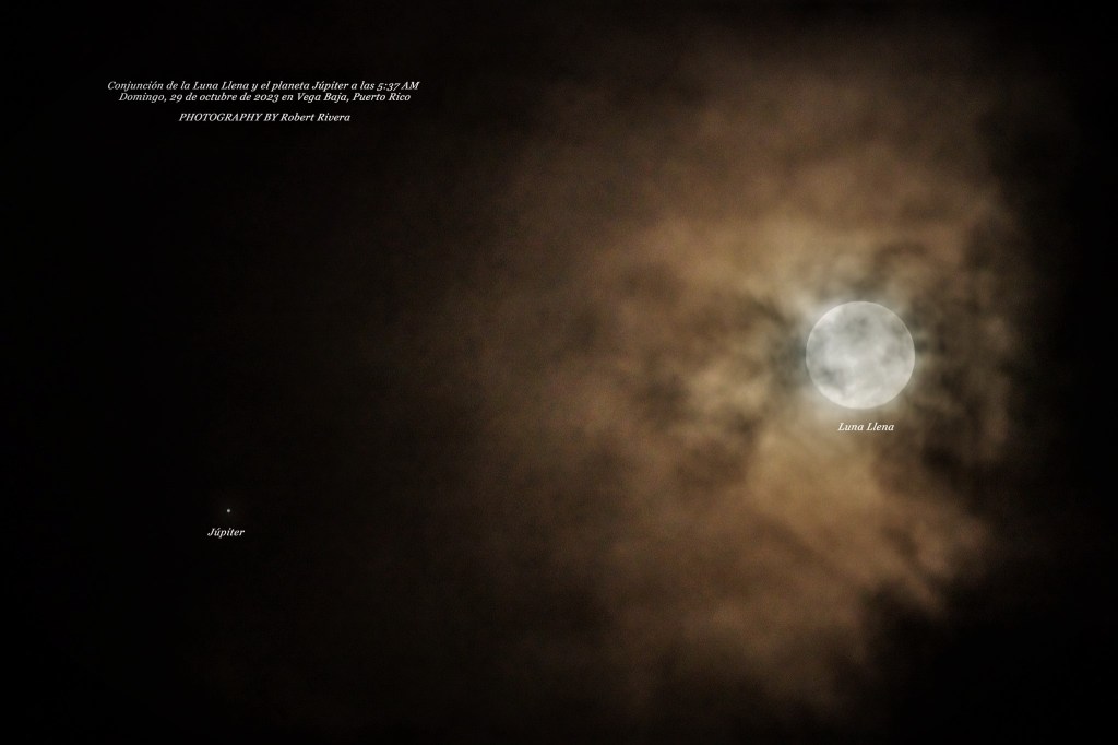 Espectacular la Conjunción de la Luna Llena y el Planeta Júpiter arropada entre nubes que hacían que su luz se viera bien tenue.