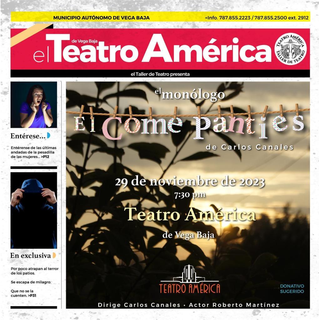 Recuerdo que, estudiando en tercer grado en la escuela elemental del barrio, una mañana los estudiantes nos enfrentamos con una sorpresa que se volvió sorpresiva: tres pantys picados donde sabemos estaban colgados en la verja. Nosotros no salíamos del asombro y nos parecía divertido. Viendo esa imagen en el tiempo, diría que era una instalación de arte, quien los colocó en la verja se adelantó a las instalaciones artísticas de Pepón Osorio. En las últimas décadas, el come panty ha sido parodiado en la radio y en la televisión. Las parodias me ayudaron a recuperar la memoria. Cuando decidí escribir narraciones y obras de teatro que se desarrollen en el barrio de Carolina donde viví mil años, volvió esa historia del come panty. Cuál es la misión del escritor, pues escribir. Como toda obra de teatro es complicado el comienzo. Cuándo y cómo empieza la obra es la pregunta. Pero hay una segunda pregunta: ¿por qué?, ¿cuál es la motivación del personaje? Hace siglos dejó de importarme esa pregunta. Por lo tanto, no sé la causa de mi come panty, ni me interesa saberla. Lo que sí me importó saber cuál es el conflicto del presente. Me costó descubrirlo. Una tarde vi al come panty caminando de lado a lado en una plaza. Pocas veces tengo imágenes. Y de golpe, comprendí y me dije: “te llegó la hora, come panty, ya tengo tu historia”. Entonces, ayudé al come panty a tomar la decisión y me enteré de su conflicto. ¿Por qué y para qué vamos a un psicólogo o a un psiquiatra? En una película protagonizada por Richard Prior, el interpreta a un veterano de Vietnam, el psiquiatra le pregunta: «¿tienes algún problema?» Prior y el psiquiatra ríen. En esa terapia, el come panty no se reprimió y se desbordó… Yo estaba presente escuchando su historia. Porque los escritores somos atisbadores. El Come Panty ha pasado por un proceso de años de escritura. Primero fue un monólogo, después añadí otro personaje, volvió el monólogo breve, un relato largo y por último la versión monologal que se estrenará el 29 de noviembre de 2023 en el Teatro América de Vega Baja.