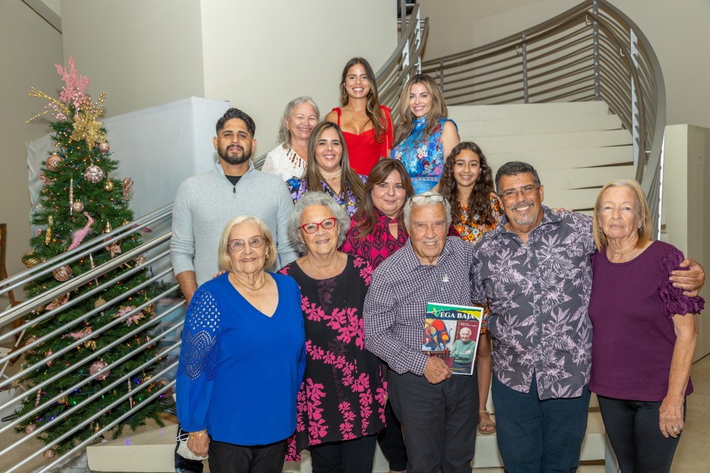 En la tradicional foto de la escalera de los triunfadores vegabajeños, aparecen familiares del artista vegabajeño Pedro J. Brull Torres que le acompañaron en la actividad de la presentación de la revista Vega Baja Num 8 dedicada a su persona y obra (Foto por Edgardo Pabón).