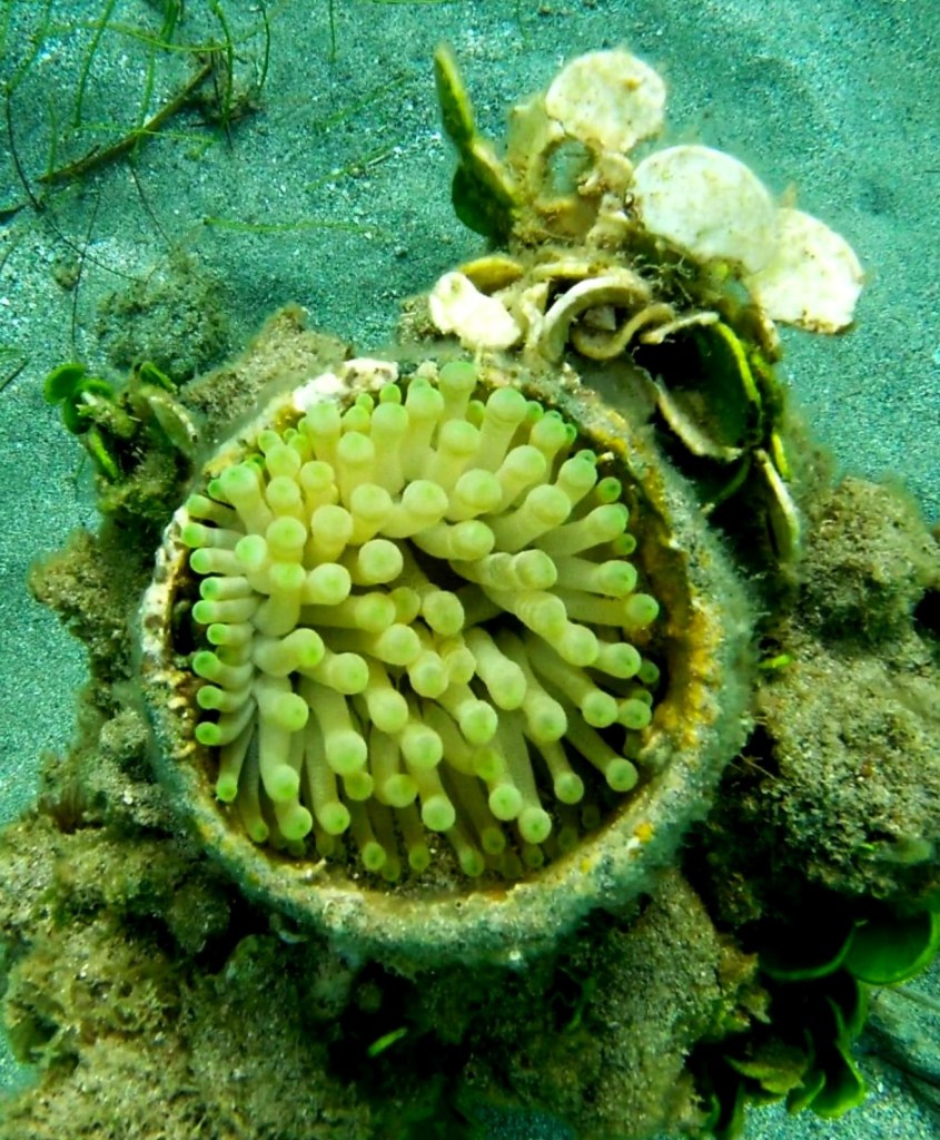 Hace más de 14 años las bases de las boyas de embarcaciones, no de seguridad de bañistas, fueron eliminadas en el área cerca a la de los bañistas y en este 2023 observé que esta anémona juvenil la tomo como su nueva casa ya que las corrientes llenaron el tubo con arena y quedó suficiente espacio para ella reciclar ese lugar y hacerlo su casa.