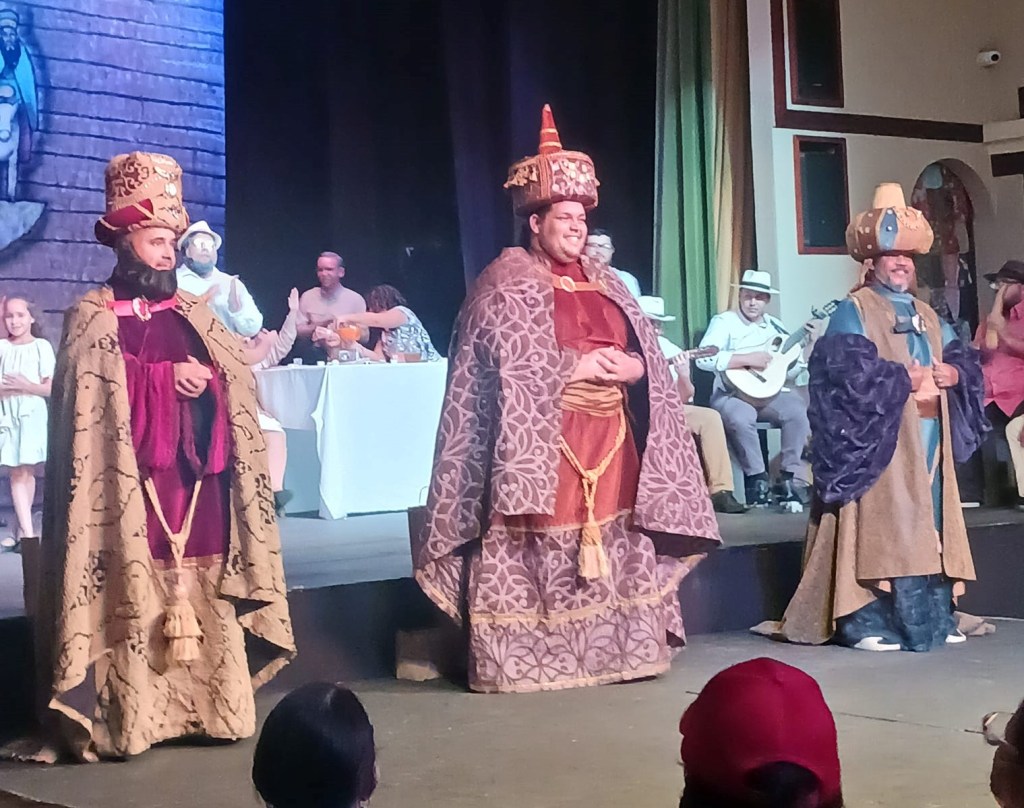 La iluminación acertada, el joven Alberto Rivera, que fue mi discipulo hace unos 12 años en el Taller de Teatro de la Lino, ha ido madurando como luminotécnico, pero Alberto, falta un poco de afinación. Los músicos y cantaores estuvieron muy bien. Los otros temas traidos por el autor y la directora, que de hecho en la función de esta noche no fue presentada, lo que considero una falta de reconocimiento a la ardua labor de dirigir mas de 20 personas en escena, estuvieron a tono; el noviazgo secreto, los bailes de ambientacion, la pelea de novios por la moza, la ceremonia del rosario, la preparacion del «Altar» de los Reyes y claro esta, la entrada triunfal de los Reyes que estuvo muy bien ambientada y majestuoso vestuario.