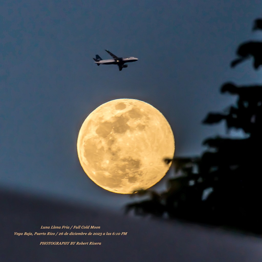 Mi disparo de suerte esta noche, porque apenas estaba tratando de ubicarme para poder contemplar, admirar y decirle adiós a la última Luna Llena del Año 2023, la que llaman #LunaLlenaFría / #FullColdMoon . La verdad es que me emocioné mucho cuando ví a lo lejos que venía volando un avión a las millas de chaflán.