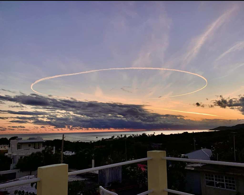 Si el vuelo fue circular, deja un círculo en el cielo, o si pasaba en línea recta, deja línea de nubes. Esas nubes por lo general se disipan bastante rápido. Pueden leer más aquí: https://www.nasa.gov/…/atoms/files/contrails_k-12.pdf