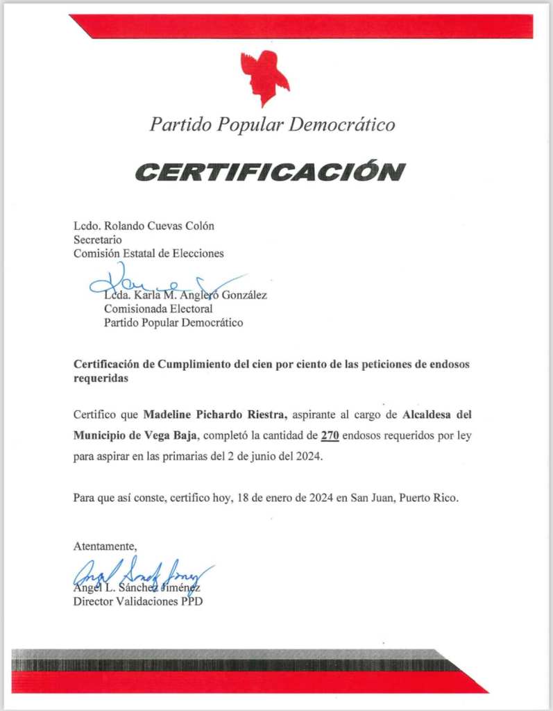 La candidata a alcaldesa Madeline Pichardo Riestra completó el requisito legal de endosos dispuesto por ley, haciendo oficial su participación para aspirar en las primarias para alcalde de Vega Baja en el Partido Popular Democrático.