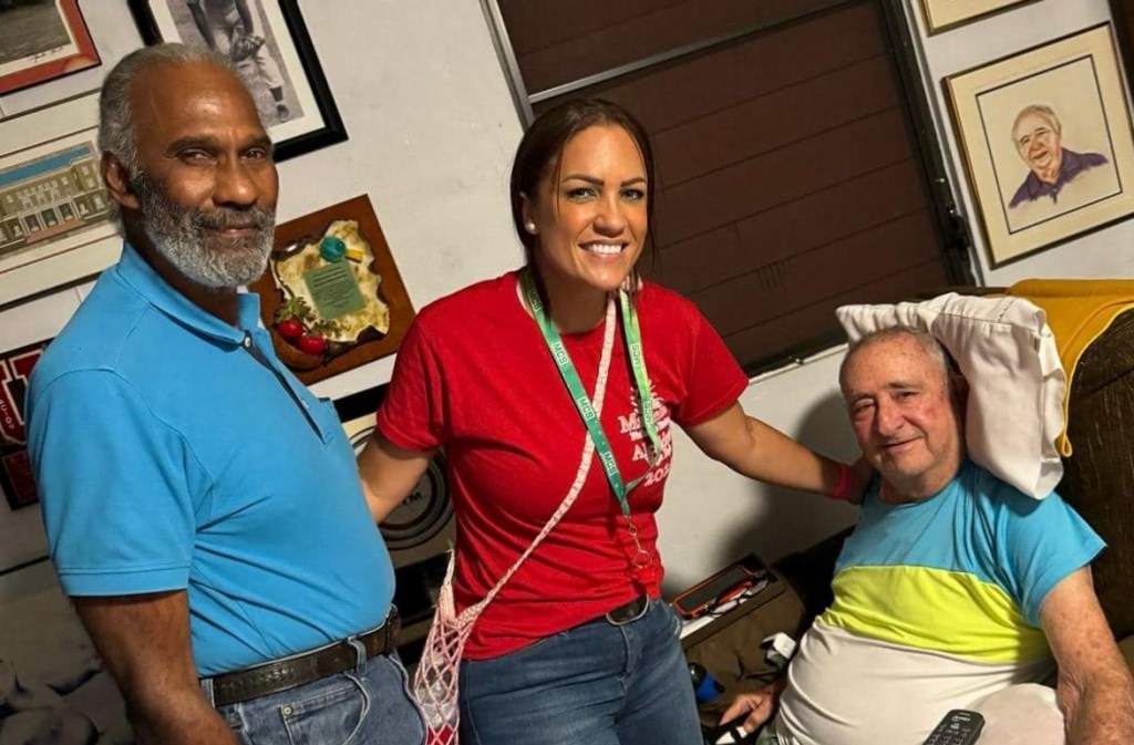Cuando la invitan a pasar al interior, se sorprendió agradablemente de encontrar a Herminio Marrero que también estaba de visita y luego conocer al gran deportista vegabajeño, Dr. José Manuel Portela quien siempre tiene ideas para mejorar el deporte en Vega Baja.