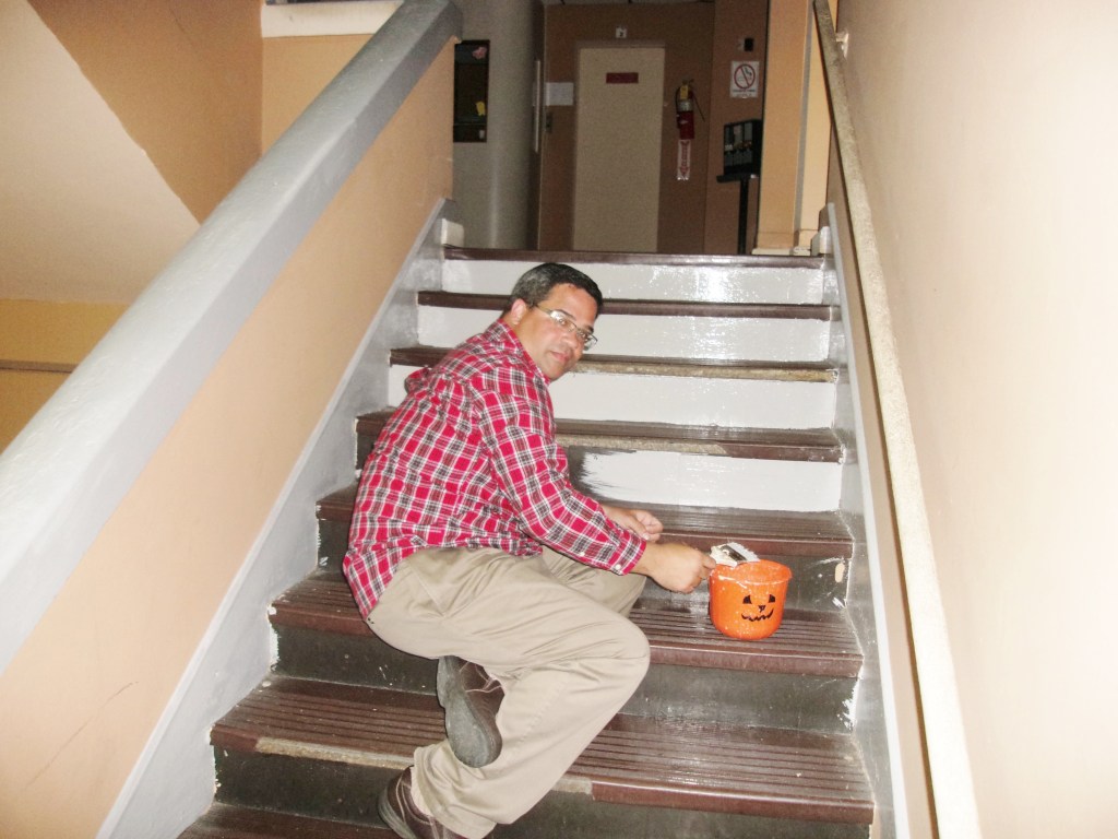 Pregunté por el Alcalde y me dijeron que estaba en el Segundo Pido. Voy subiendo la escalera y por poco piso a otro obrero que estaba casi acostado pintando en cada peldaño de la escalera. Ninguno quería que lo retratara porque no deseaban crédito por lo que estaban haciendo en su tiempo libre, de forma voluntaria y con mucho amor y satisfacción.