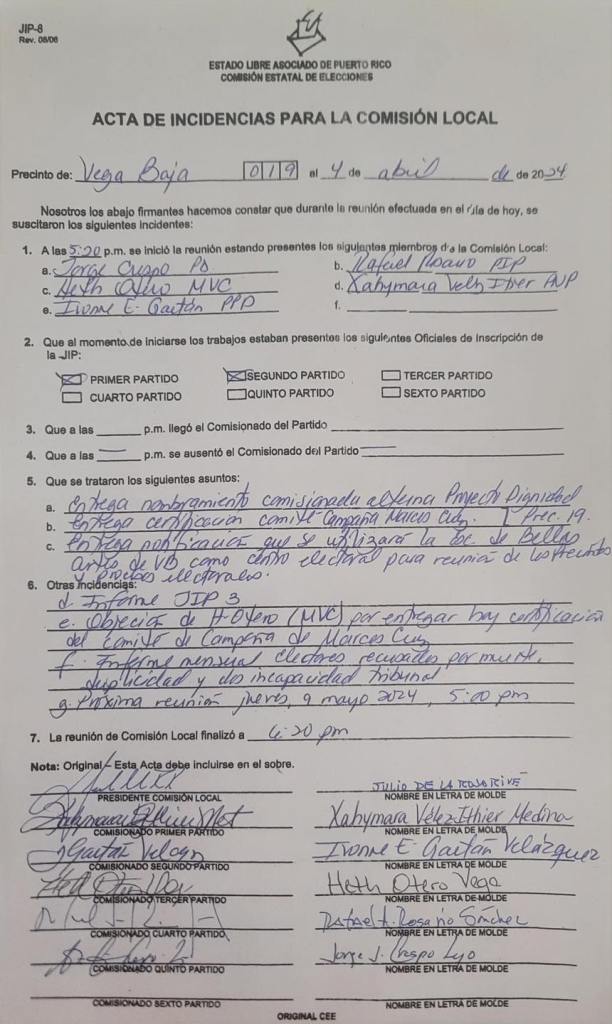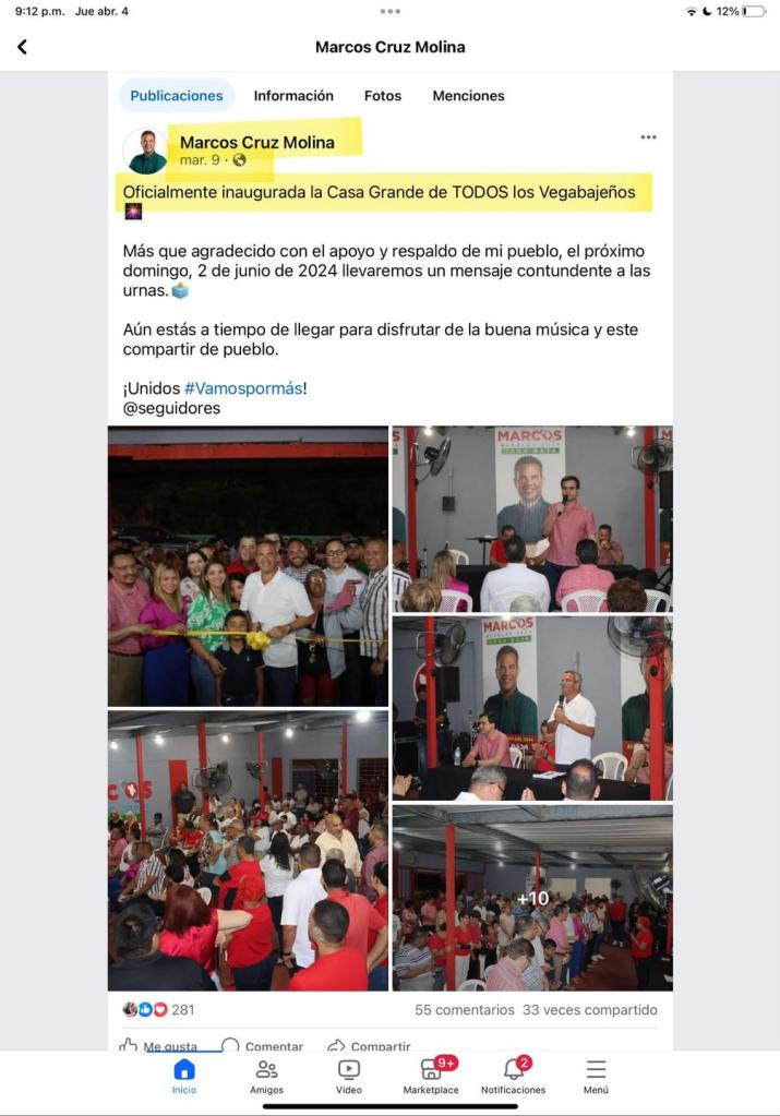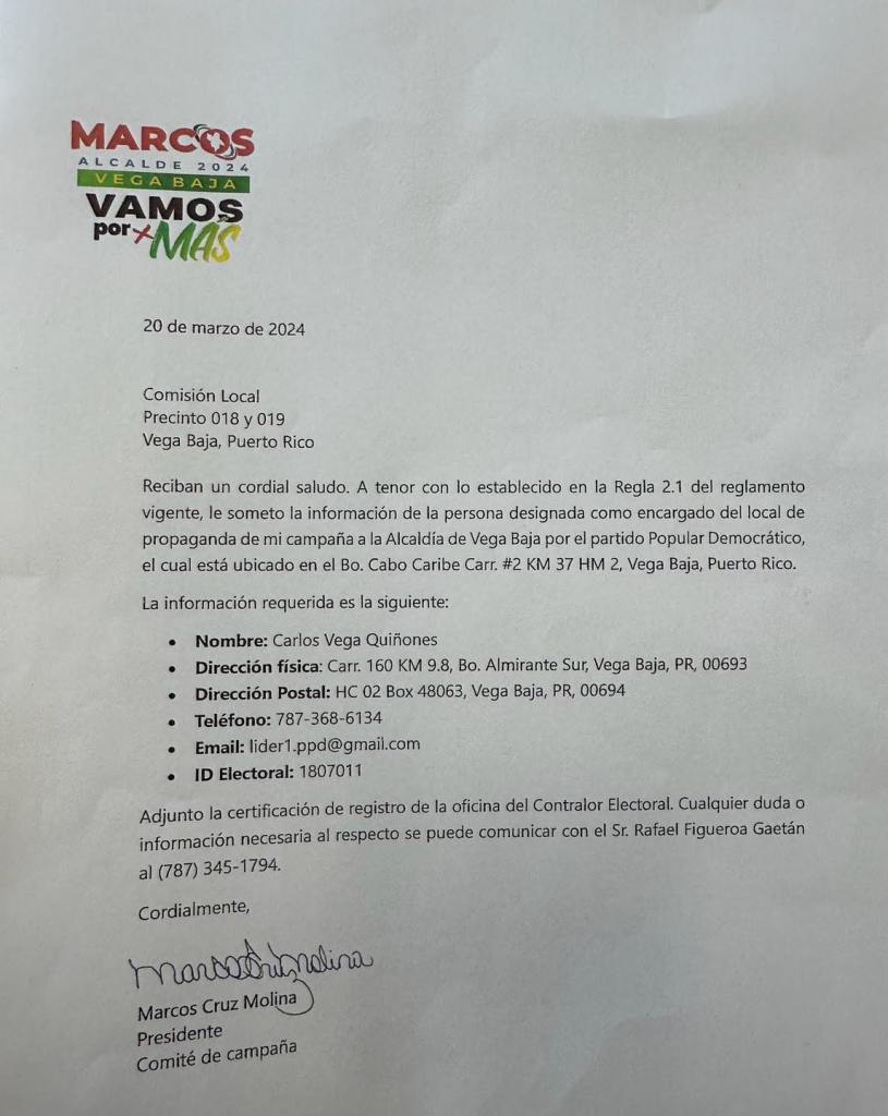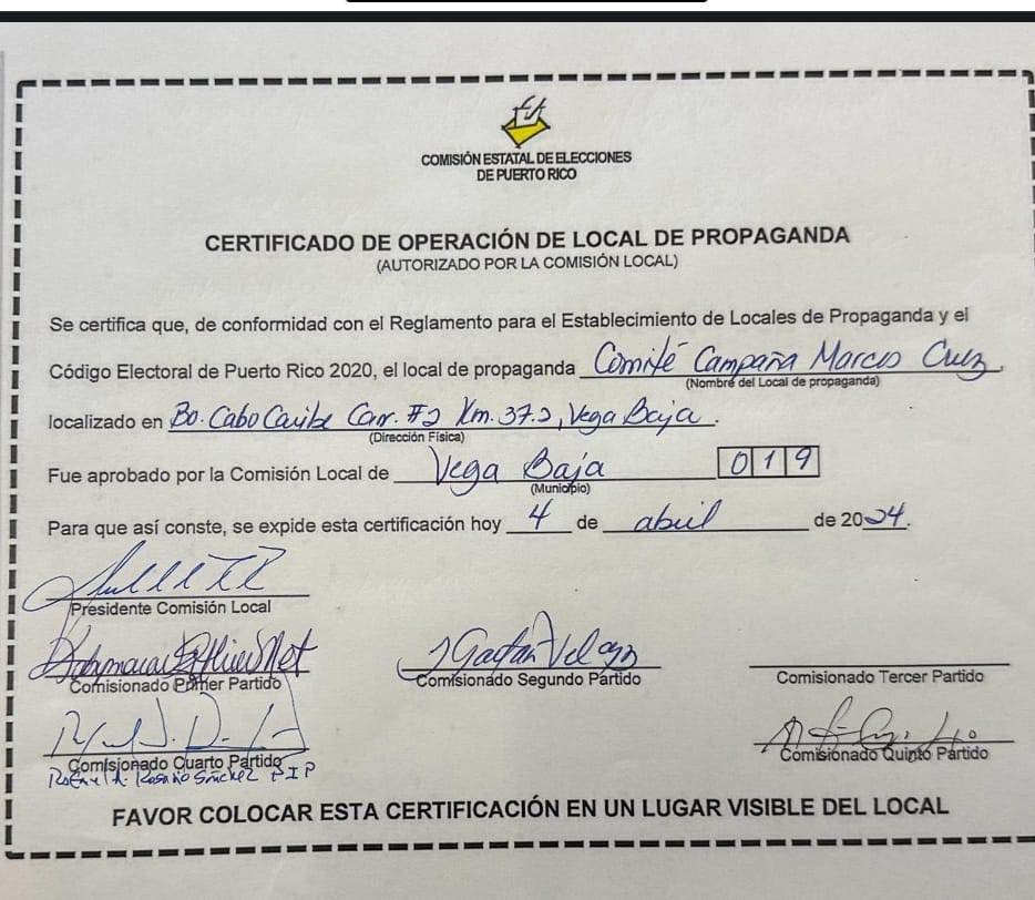 Una vez más el alcalde Marcos Cruz Molina le miente a los vegabajeños y vegabajeñas. El certificado que el alcalde acompaña en su publicación (Documento Adjunto) fue llevado lleno por las comisionadas del PPD en la reunión del pasado 4 de abril. El comité fue inagurado el 9 de marzo. En esa reunión de comisionados del 4 de abril,se les pidió a los comisionados de los demás partidos que lo firmaran. Nuestro comisionado electoral levantó bandera haciendo referencia a que el alcalde nunca presentó la solicitud como establece la normativa electoral. El certificado que las comisionadas del PPD llevaron lleno es nulo porque nunca se presentó una solicitud para operar el comité. El certificado es el resultado de un proceso que empieza con una solicitud que nunca el alcalde ni sus comisionados presentaron al pleno de la comisión. No presentaron nunca una solicitud ni en el Precinto 18, donde está anclado el comité, ni la presentaron en el precinto 19. Nuestro comisionado hizo lo correcto al no firmar un certificado que lo llevaron lleno para que se firmara aún cuando el proceso establecido en ley no se hizo. El comité comenzó a operar y opera sin haber cumplido con las disposiciones del reglamento y el código electoral. Esa es la verdad.