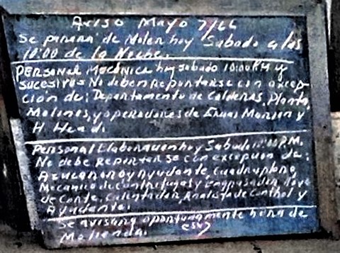 1966 (7 de mayo). Pizarra de la Central San Vicente para anunciar cuando había trabajo para los obreros. Se colocaba en el piso de la puerta más cercana a la parada de los vehículos públicos que viajaban al Barrio Cabo Caribe este y barrio Ceiba, sector Sabana, donde los empleados de la Central San Vicente y sus dependencias que no caminaban a pie, viajaban en éstos. Como no había una manera de comunicación como en nuestros tiempos, esta pizarra les daba las noticias del estado de trabajo y funcionamiento en la Centra. Fototeca Jimmy Rosario 1300004 PIZARRA DE CENTRAL SAN VICENTE FRENTE A FARMACIA NATER 1966 C2022 (detalle).
