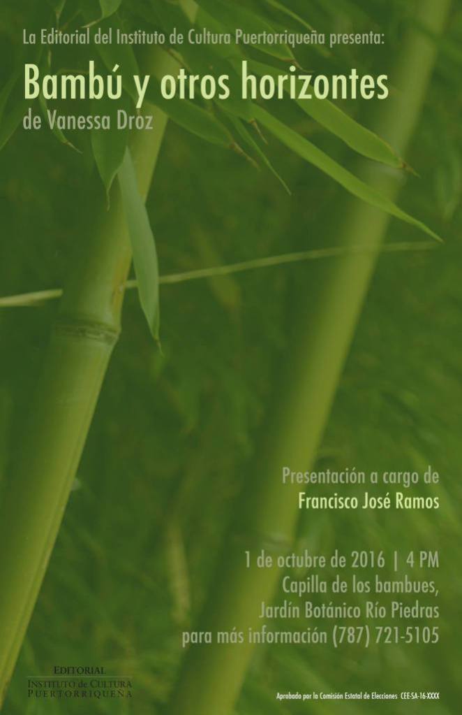La contemplación del entorno natural del ser humano ha servido desde siempre como inspiración para la creación artística y literaria. El haikú, forma japonesa de poesía cuya historia se remonta al siglo VIII, se caracteriza tanto por el asombro del escritor frente a la naturaleza como por la brevedad de la palabra. El nuevo libro de Vanessa Droz, Bambú y otros horizontes, publicado bajo el sello de la Editorial del Instituto de Cultura Puertorriqueña, explora esta milenaria tradición poética y la acerca a la exuberante flora caribeña.