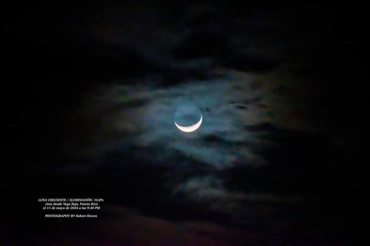 Intentando observar y retratar las auroras boreales, pues capturé la LUNA CRECIENTE / ILUMINACIÓN: 10.8% vista desde Vega Baja, PR el 11 de mayo de 2024 a las 9:20 PM.