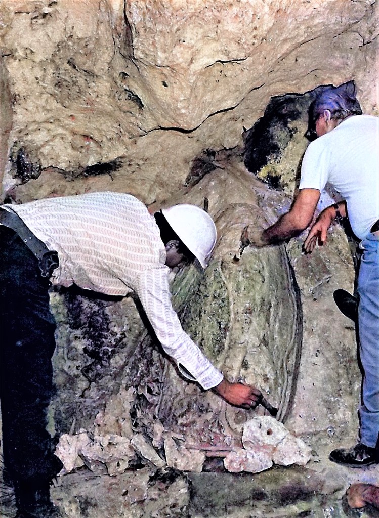 Los miembros de la Sociedad de Investigaciones Históricas y Arqueológicas SEBUCO Robert Martínez Rivera y Genaro Otero Campos realizan labor de reproducción de petroglifo encontrado en una de las cuevas de la Carmelita en Vega Baja en 1976. Fototeca Jimmy Rosario 10004932.