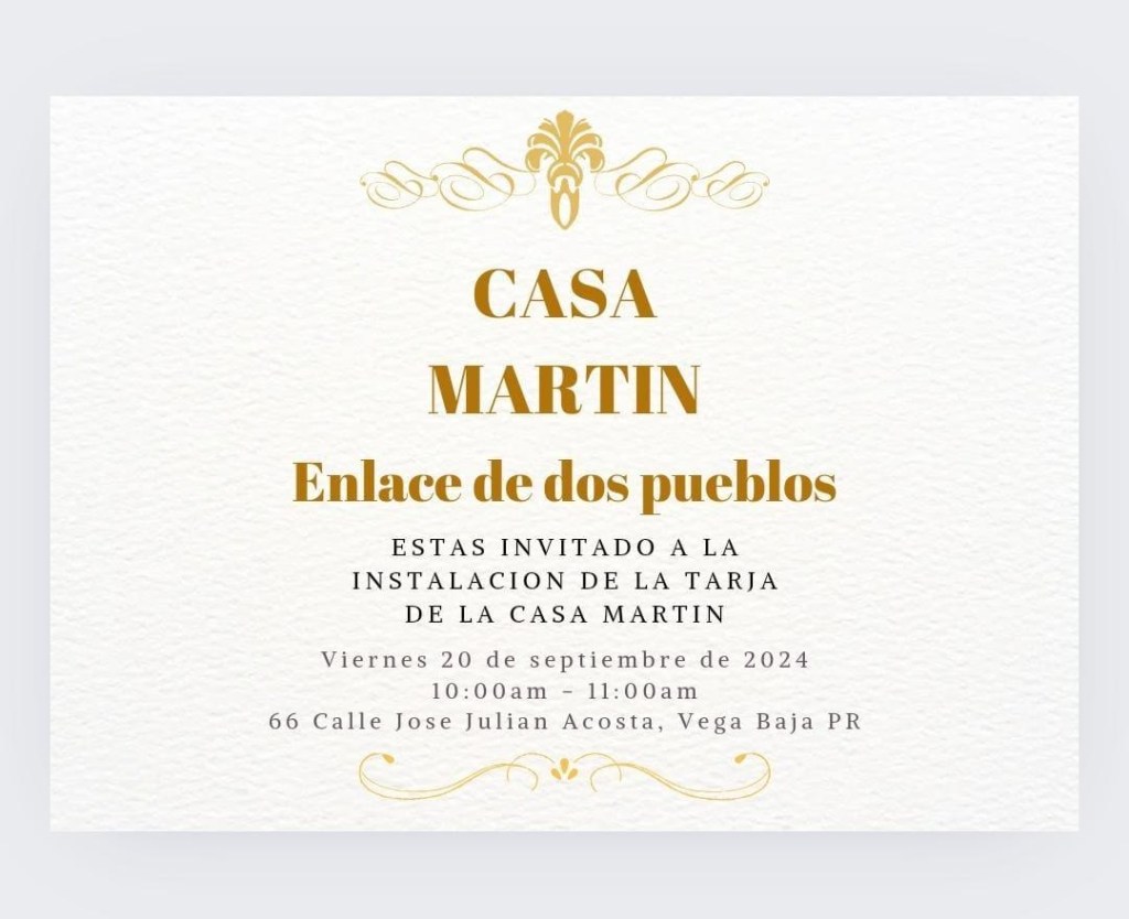 Descendientes de la familia Martin, quienes residieron en la Calle José Julián Acosta de Vega Baja, junto a la administración del Gobierno Municipal y el Instituto de Cultura Puertorriqueña, colocarán una tarja para recordar la aportación de la Familia Martin a nuestra ciudad. La actividad se ha titulado «Enlaces de dos pueblos» para significar la tradición aportada por un español que se integró a nuestro pueblo hasta permitir que sus restos descansen en nuestra tierra.