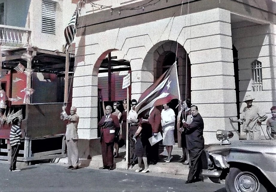 Entre las personas que podemos identificar en la foto se encuentran el alcalde Rafael Cano, Sr. Carrelo izan banderas de Puerto Rico y americana en el décimo aniversario del ELA, 25 de julio de 1962, una persona ataviada como jíbaro con pava como la insignia del Partido Popular y Casimiro Ramos Barreto.
