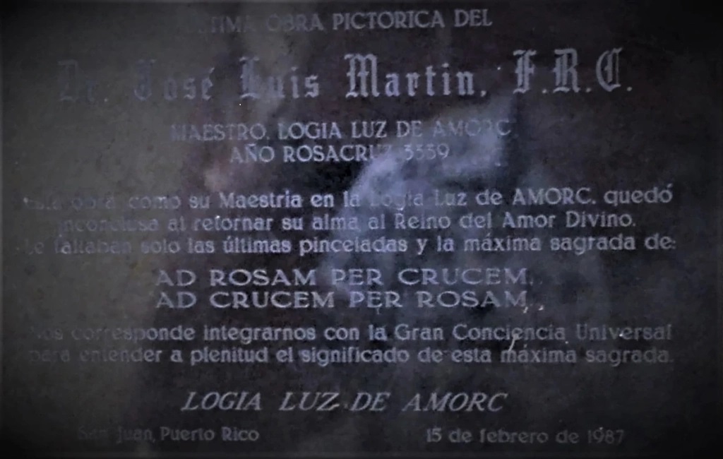 «Ultima obra pictórica de José Luis Martin, F. R. C. Maestro, Logia Luz de AMORC, quedó inconclusa al retornar su alma al Reino del Amor Divino. Sólo faltaban las últimas pinceladas y la máxima sagrada de AD ROSAM PER CRUCEM. AD CRUCEM PER ROSAM. Nos corresponde integrarnos con la Gran Conciencia Universal para entender a plenitud el significado de esta máxima sagrada. Logia Luz de AMORC. San Juan, Puerto Rico, 15 de febrero de 1987.»