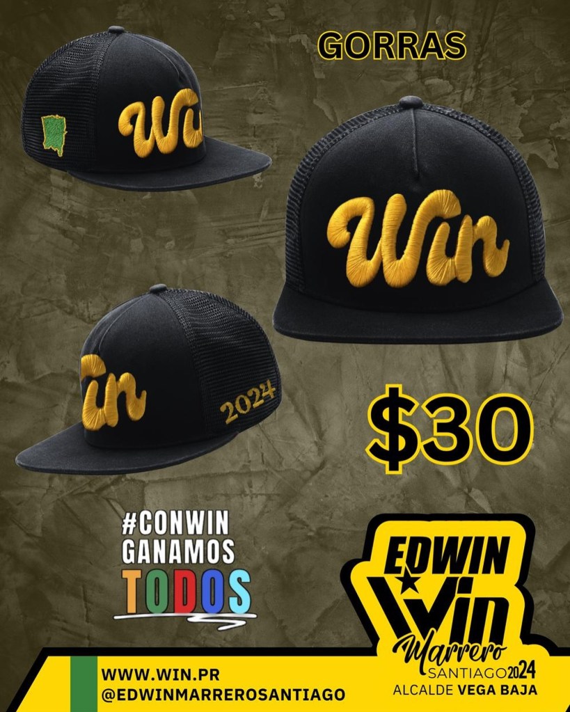 Edwin Marrero Santiago es el candidato a alcalde por el Movimiento Victoria Ciudadana. Aprovechando que su apodo derivado es Win y eso en inglés significa ganar, ha creado una serie de gorras y de camisas con esa palabra que bien pueden servir para su campaña política o cualquiera la puede utilizar para su uso personal, pues no tiene ningun otro emblema ni explicación excepto el mapa de Vega Baja y el número 2024 del presente año.