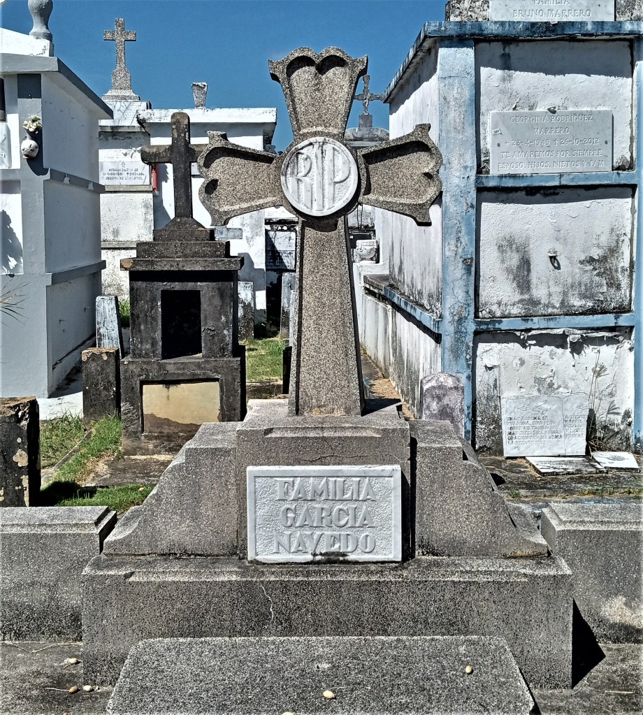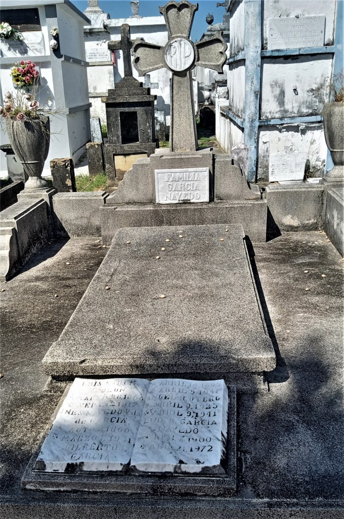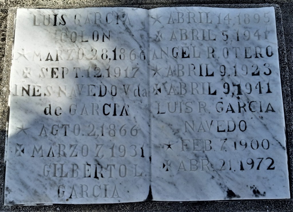 En la lápida aparecen los nombres de Luis García Colón, nacido en 28 de marzo de 1866 y fallecido el 12 de septiembre de 1917, de Inés Navedo viuda de García, nacida el 21 de agosto de 1866 y fallecida el 7 de marzo de 1931. De ese matrimonio, solo conocí a José (Pepe) García, un maestro retirado y poeta que residía en la Playa Puerto Nuevo.