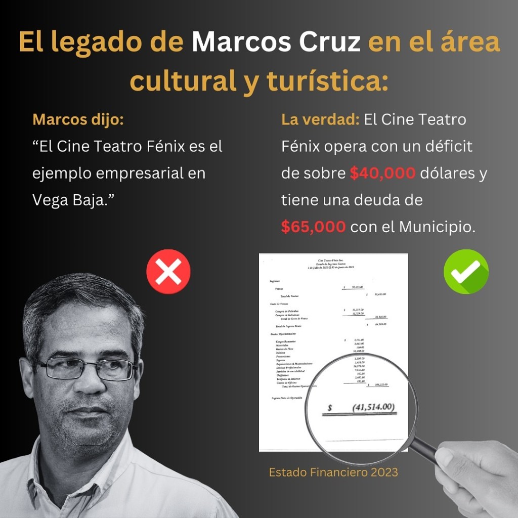 El Gobierno Municipal debe cambiar la información y la visión de operación del Cine Teatro Fénix. No debe mentir cuando es evidente que no es una operación exitosa. Siendo la única empresa municipal, no es buen ejemplo, por lo que Edwin (Win) Marrero lo ha adoptado, con razón, como un issue político. El mismo Marcos Cruz Molina, con sus actuaciones, lo ha convertido en un asunto de esta temporada electoral. Los detalles negativos evidentes están en el maquillaje que le ha dado a los informes económicos obviando la inversión y aportación municipal para lograr la operación de día a día y mentir diciendo que cubre sus gastos.