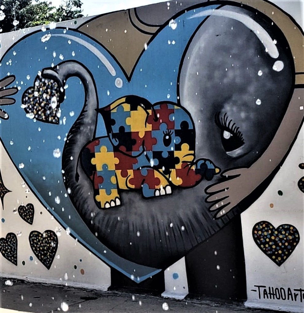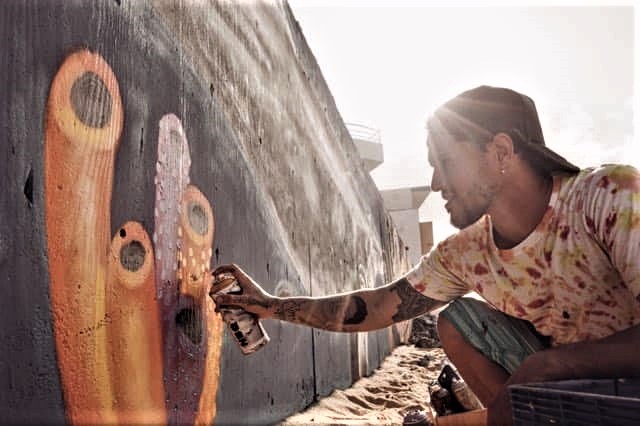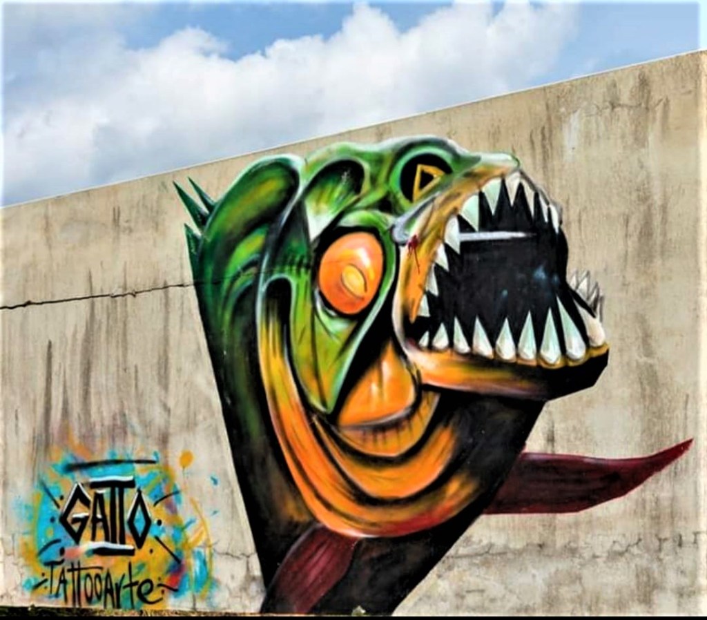 Victor Cabán Torres » Gallo», de Vega Baja, es el creador de esta pintura del Ojo de Agua. Uno de sus primeros arte en la vecindad fue el del pez con una afilada dentadura, mural que estaba hacia el lugar del caño pero que ya no existe. Ha realizando otros trabajos cual ha dedicado a condición del autismo en la Isla. ¡ Gracias, Gallo !