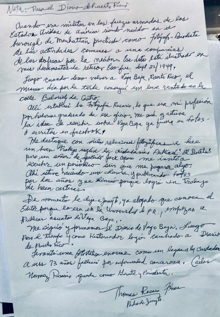 NOTA DEL EDITOR: El Diario Vegabajeño de Puerto Rico se complace en presentarles una carta editorial enviada hoy 31 de enero de 2026 a este diario por el presidente y fundador de este espacio, Thomas Jimmy Rosario Flores. En ella, a puño y letra, nos ilustra de su paso por la fotografía, aquellos proyectos realizados con su amado hijo Jimmyto y reafirma su postura de mantener vivo el legado que él y Thomas Jimmy Rosario Martínez han logrado por décadas. Es un honor presentarles íntegramente la carta de Don Jimmy, a sus 97 años, al pueblo de Vega Baja. Cuenten todos con muchos años, como el mismo dice, «de propina».